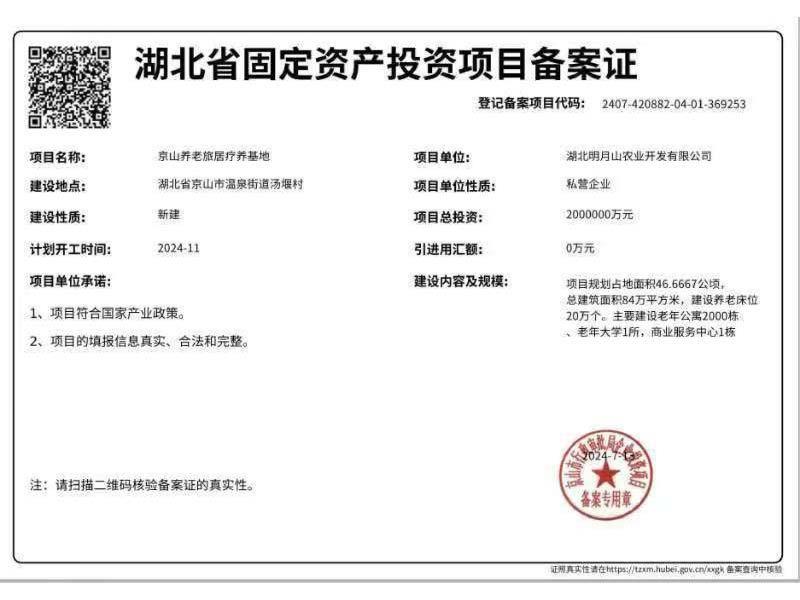 湖北明月山农业开发有限公司成立2014年12月30日,公司统一社会信用代码:914208213260966123。拥有京山养老旅居项目与华夏农谷科技园项目两个板块,政府批复土地9000亩,总投资400亿人民币,2024年7月11日通过湖北省发改委批复、国家发改委同意、京山审批局颁发2个证《湖北省固定资产投资项目备案证》200亿,华夏农谷科技园项目。2024年7月13日,《湖北省固定资产投资项目备案证》200亿人民币,2025年3月10湖北明月山农业开发有限公司加入中国公销社总社与财政部成立的办事机构,中国农产品流通经纪人协会工作委员会,第二届副会长,京山市养老旅居项目,与农业种植深加工项目,该两个项目得到国家多部门扶助对象,金效慧公司法人执行董事大股东,中投明月山温泉泉城(山西)旅游开发有限公司法人执行董事大股东,土木建筑工程师。